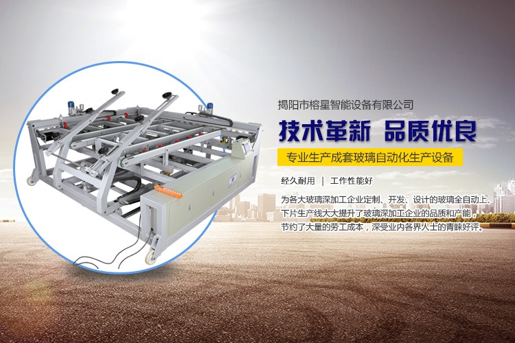 本產(chǎn)品采用人機界面加可編程控制器、真空吸附系統以及自動(dòng)控制系統組成穩定可靠的控制方式。輸送部分與堆垛部分采用步進(jìn)驅動(dòng)器與步進(jìn)電機組成,采用自主開(kāi)發(fā)切割及優(yōu)化系統,切割準確度達到±0.2mm,提高了切割的穩定性以及玻璃的切割品質(zhì)。結構由設備主框架、翻轉上片架、橫縱向輸送結構、橫縱向切割結構、橫縱向小車(chē)堆垛結構組成。